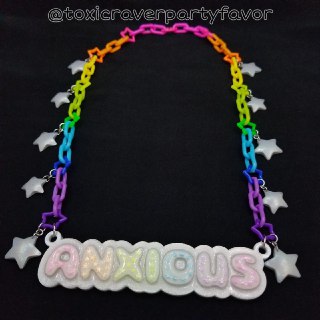 This necklace is 5.5" wide and 1.5" tall and features white letters with neon stars on a silver holographic background on 24" long rainbow plastic chain and holographic star charms.