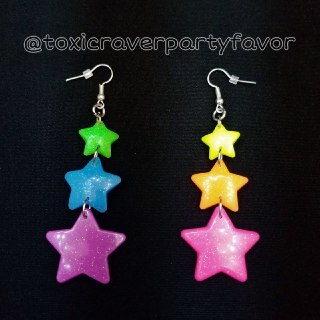 These earrings feature neon resin stars on stainless steel hooks and total about 2" long.