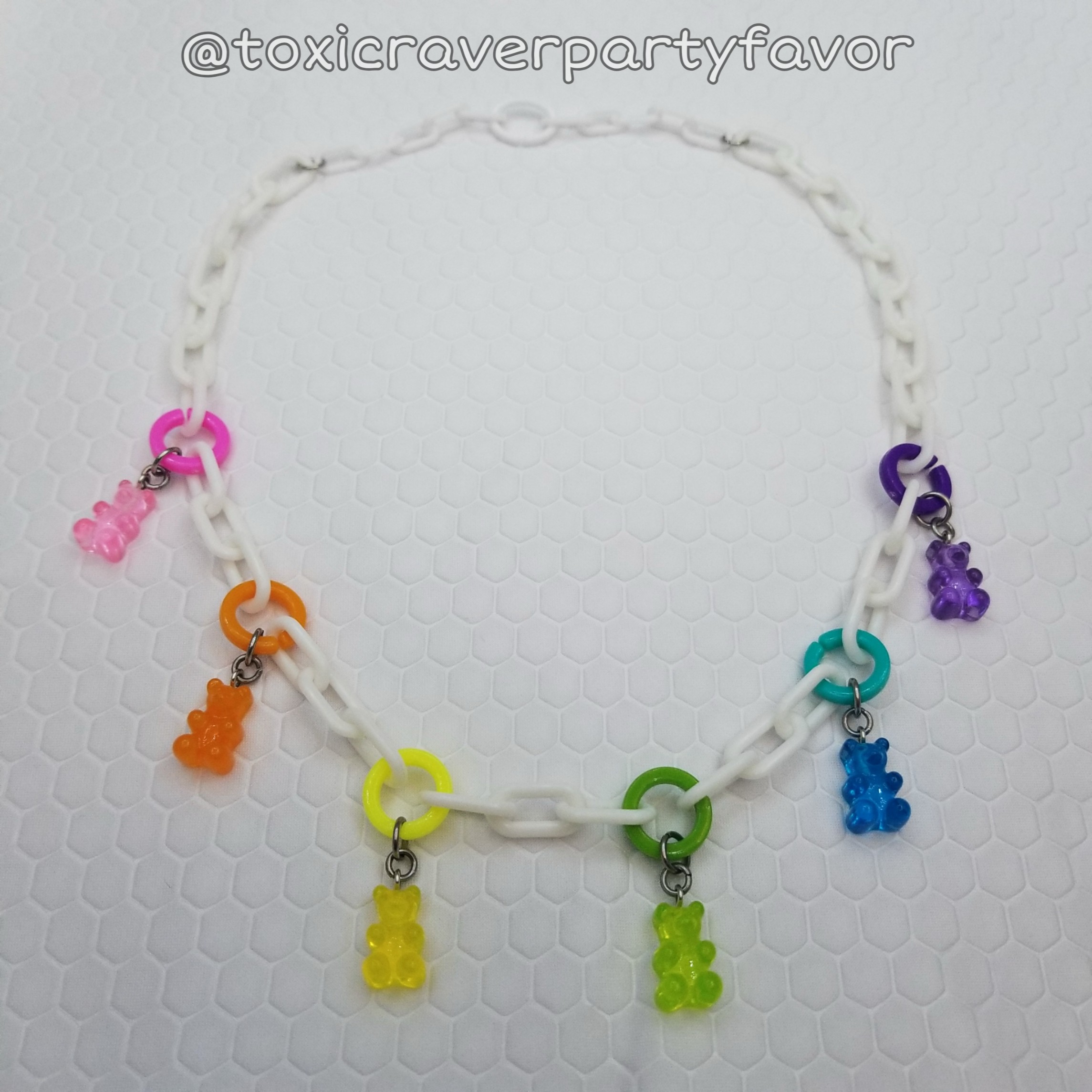 This necklace features a rainbow of gummy bear charms that are 1" long on a 22" white plastic chain that can be opened and closed with a plastic chain link