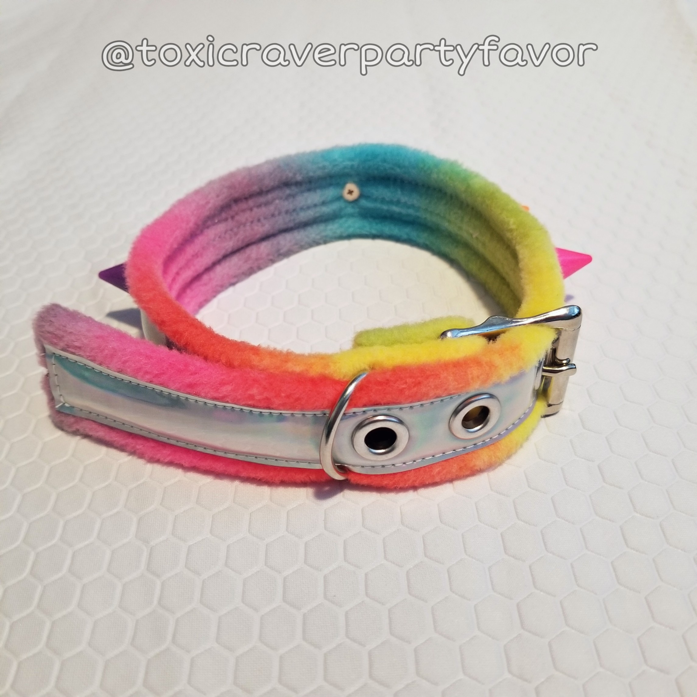 This collar is 1.25" wide and features a rainbow fleece base with silver holographic vinyl, rainbow resin spikes, and a glittery rainbow spaced out pendant. It is adjustable in length to 13", 14", and 15".