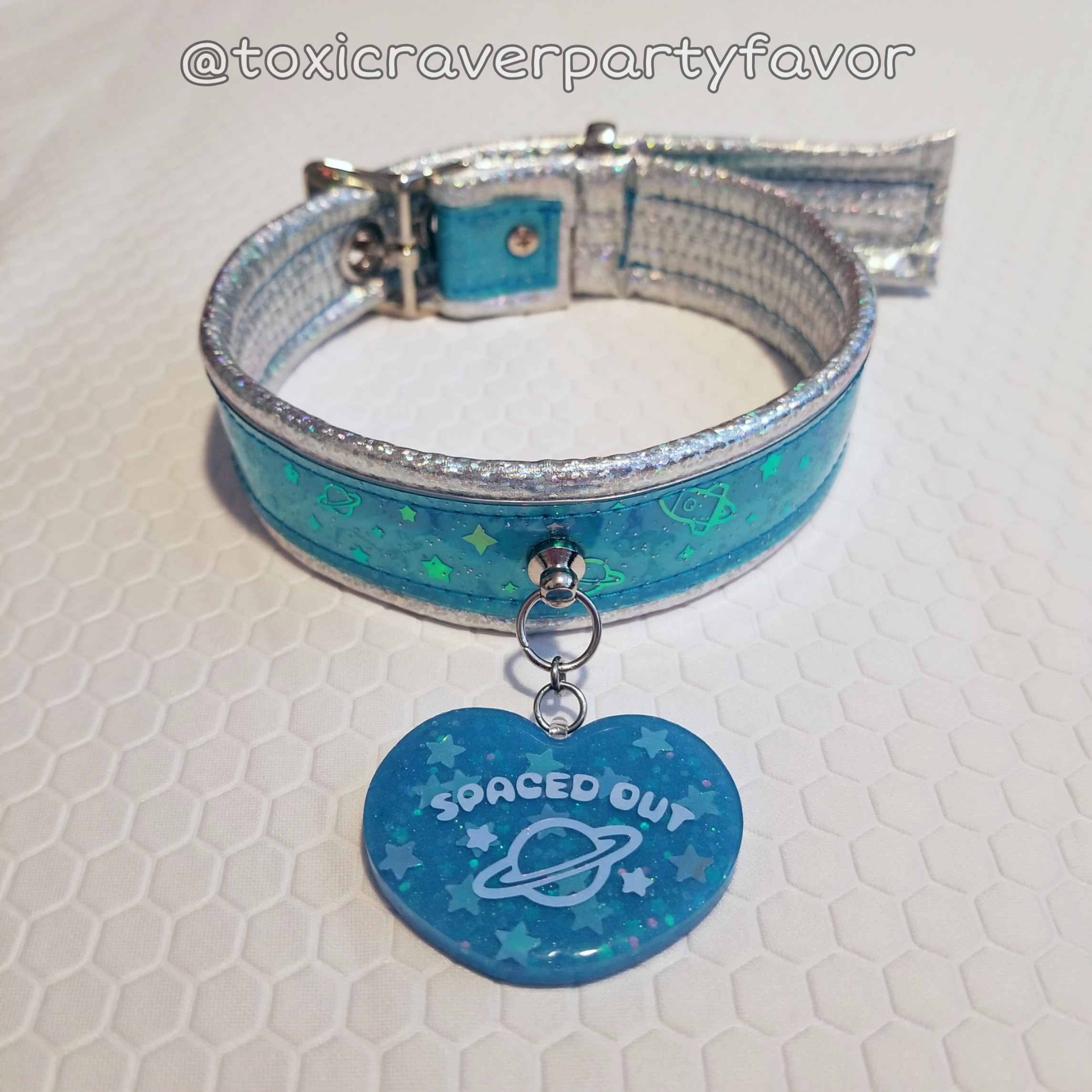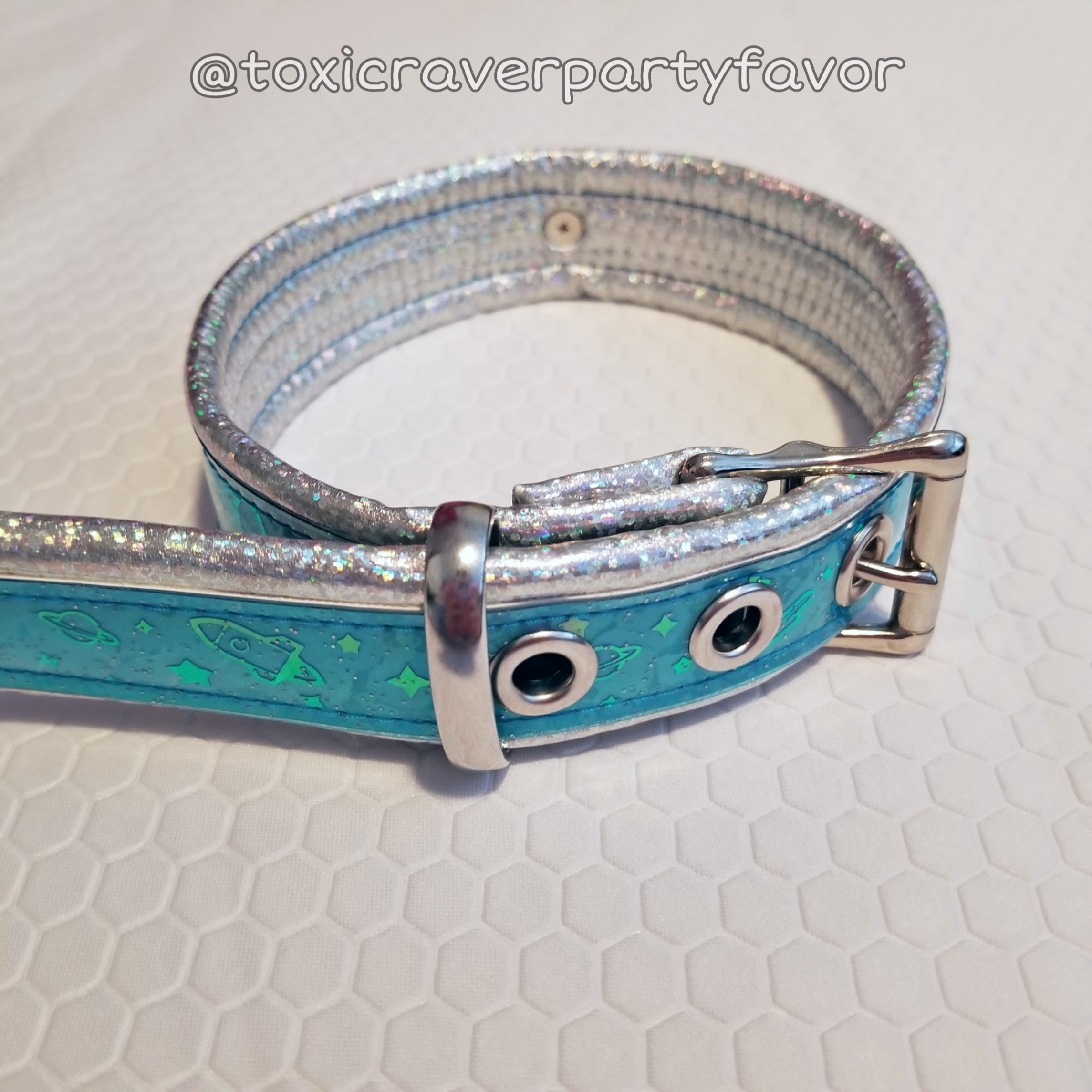 This collar is 1.25" wide and features a silver holographic base with glittery blue holographic vinyl, blue holographic space decals, and a blue spaced out pendant. It is adjustable in length to 13", 14", and 15".