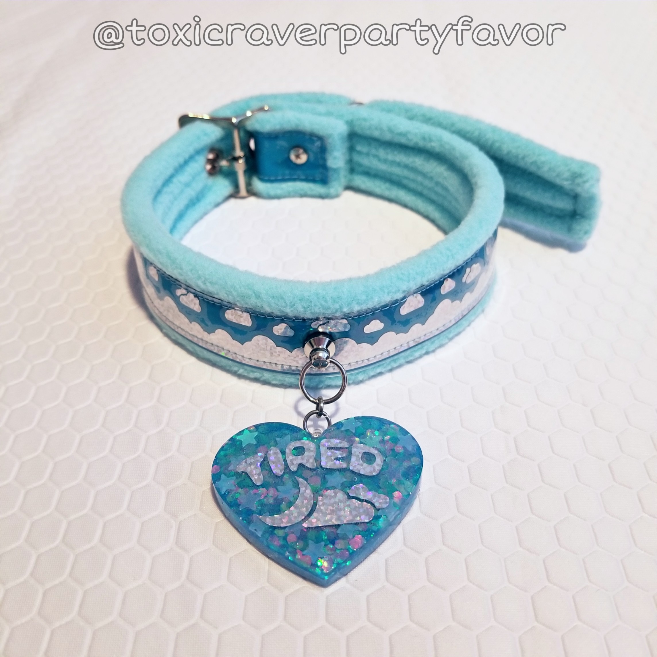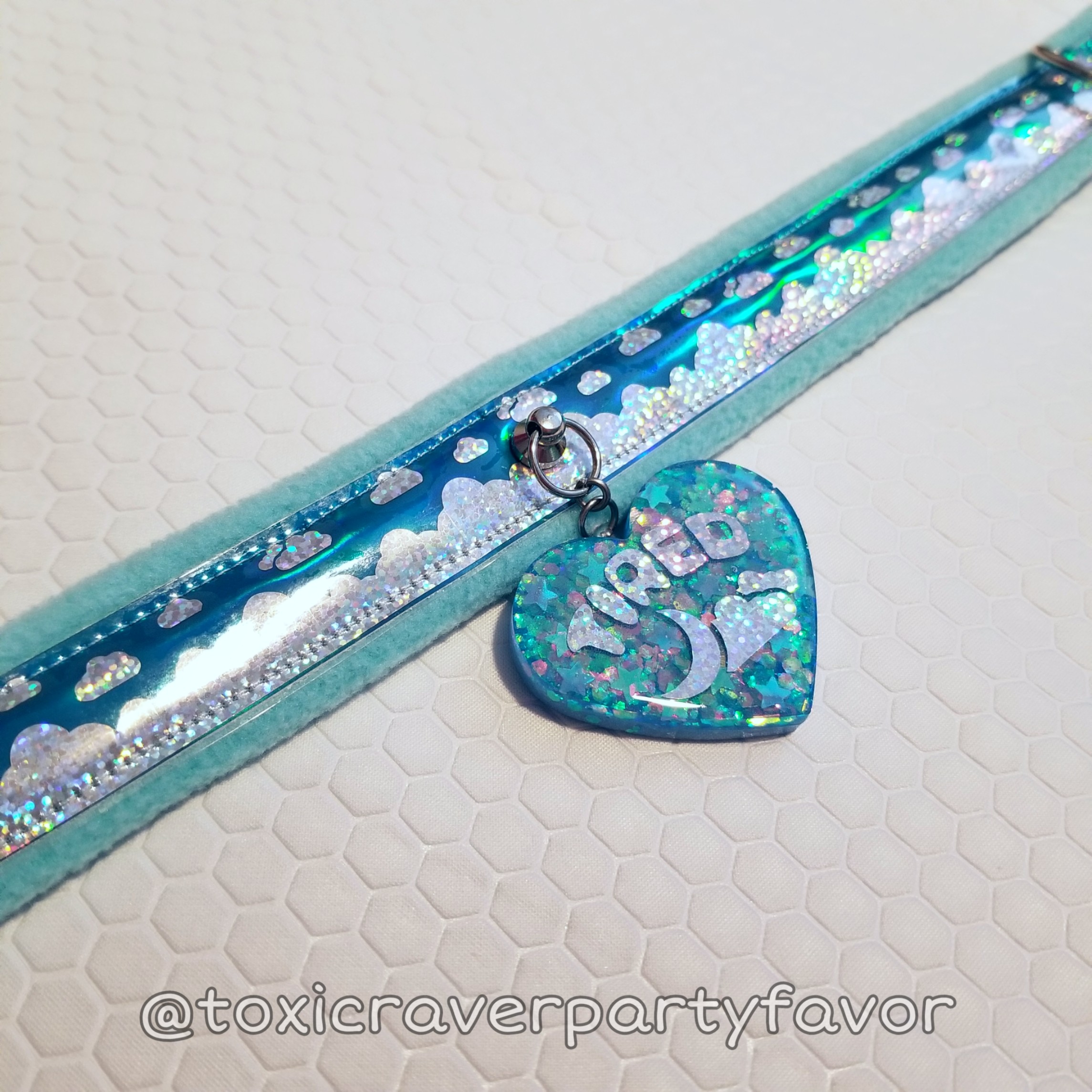 This collar is 1.25" wide and features a light blue fleece base with blue holographic vinyl, holographic glitter cloud decal, and a holographic blue tired pendant. It is adjustable in length to 13", 14", 15", and 16"